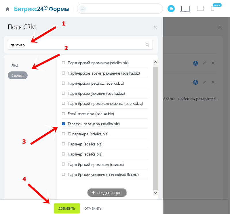 Далее нужно добавить поля, которые вы хотите чтобы партнёр заполнил, передавая вам информацию о клиенте.